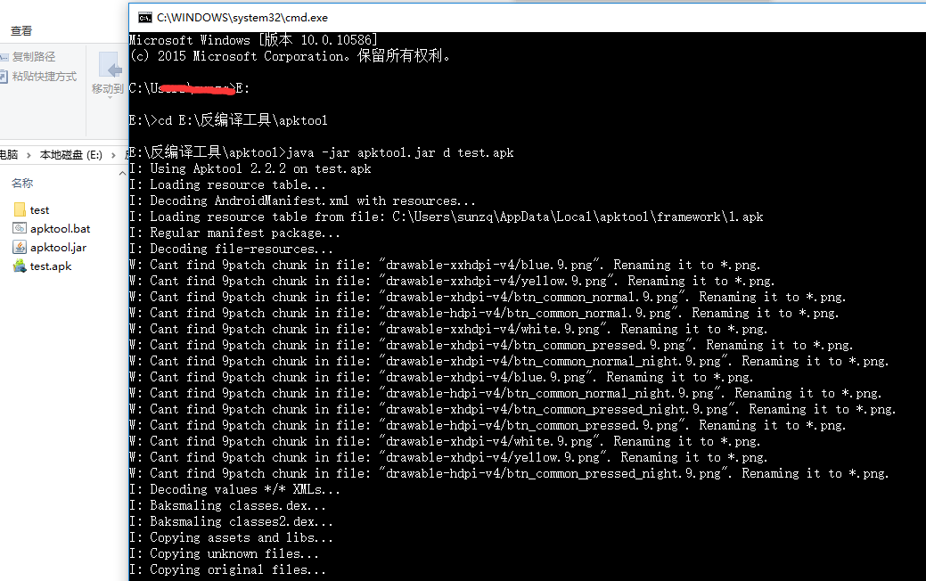 // 注意`apktool.jar`是刚才下载后的jar的名称,`d`参数表示decode