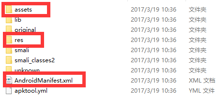 我们已经得到一个可以用文本编辑器打开的阅读的AndroidManifest.xml文件、assets文件夹、res文件夹、smali文件夹等等。original文件夹是原始的AndroidManifest.xml文件,res文件夹是反编译出来的所有资源,smali文件夹是反编译出来的代码。这里smali 不做说明。