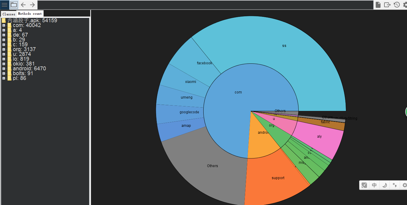 它可以直观的看到Apk 下每个包中的方法数,并且以直观的扇形图展示在右边。(这里面直接使用的是内涵段子的apk)
