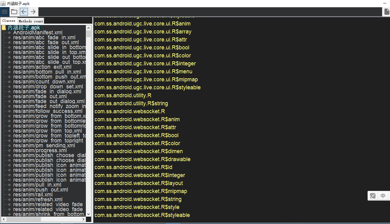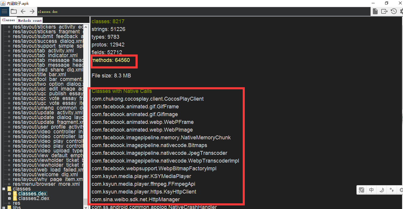 同时你可以直接看到所使用的 xml 文件等布局文件,同时你也可以看到apk下所包含的方法数是多少以及它使用的开源库等信息。