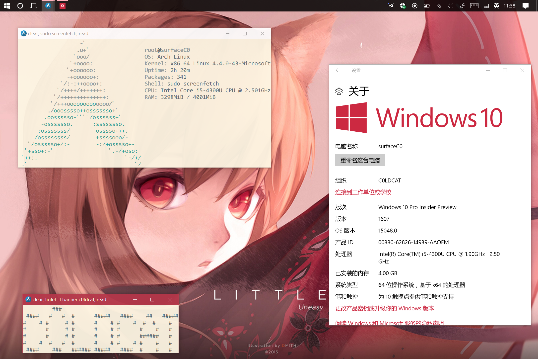 思索再三, 我决定未来用回Windows作为主要工作环境, 用了Linux(Ubunutu 1y, Debian 0.5y, Arch Linux 2.6y)多年多少有些舍不得, 操作习惯早已Linuxiz. 但是Linux作为主要使用环境太摧残强迫症了, 几年来从dm到wm, 从Gnome插件到GTK主题我一直不停在修修补补, 再加上未来对交流(QQ, 微信等)和办公(Ofiice)的需求增高, Wayland对hidpi支持还不完善, Linux Surface Pro 3的维护时间不足和遇到的种种困难, WSL的出现等众多原因助推我切换Windows, 水一篇纪念被我抛弃的Linux环境, 话说这几天做出的决定还真多, 冒着2h/d的路程时间选择走读, 切完全陌生的Windows…